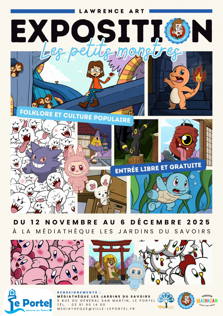 La médiathèque du Portel accueille l’illustrateur boulonnais Lawrence ART (ndlr: président de l’association Mashalaw – ACSN) pour une exposition originale et pleine de malice, consacrée aux petits monstres qui peuplent notre imaginaire.